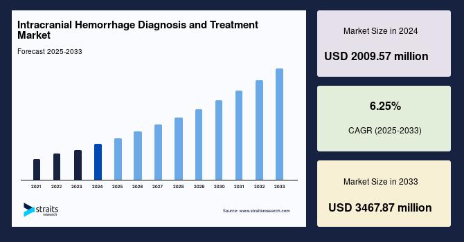 According to StraitsResearch, the global intracranial hemorrhage diagnosis and treatment market size was valued at USD 2009.57 million in 2024 and is estimated to reach USD 3467.87 million by 2033, growing at a CAGR of 6.25% during 2025-2033.
