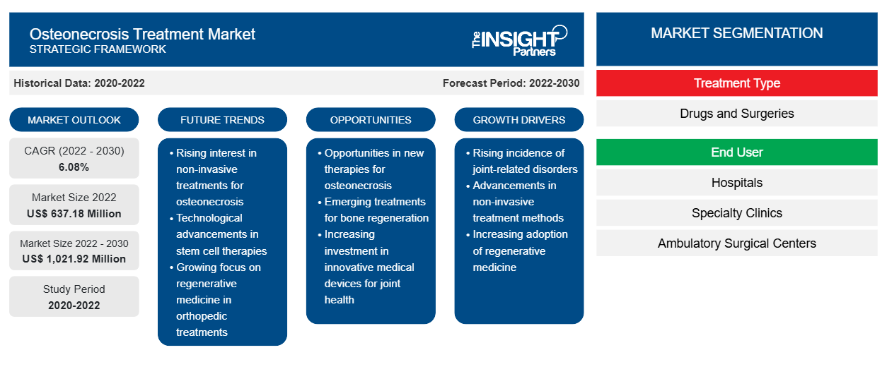 The Osteonecrosis Treatment Market is growing steadily as healthcare providers increasingly adopt advanced therapies and diagnostic solutions to address bone degeneration disorders. Within this evolving landscape, Osteonecrosis Treatment Market Segmentation Analysis highlights how treatment type, end users, and regional adoption patterns are shaping demand and innovation across the industry. The osteonecrosis treatment market size is projected to grow from US$ 637.18 million in 2022 to US$ 1,021.92 million by 2030, registering a CAGR of 6.08% from 2022 to 2030, reflecting strong demand for pharmacological therapies, surgical interventions, and regenerative treatment options worldwide.