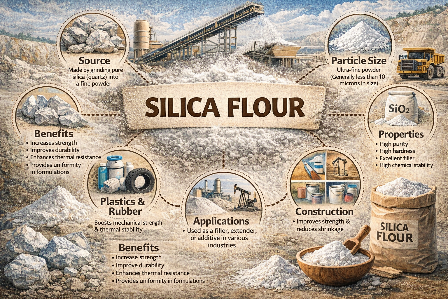 Silica flour is a finely ground high purity quartz material widely used across construction, oil and gas, ceramics, glass, and coatings industries due to its excellent thermal stability, chemical resistance, and ability to enhance mechanical strength. Its fine particle size and durability improving characteristics make it a critical industrial raw material used in high performance applications across multiple sectors.