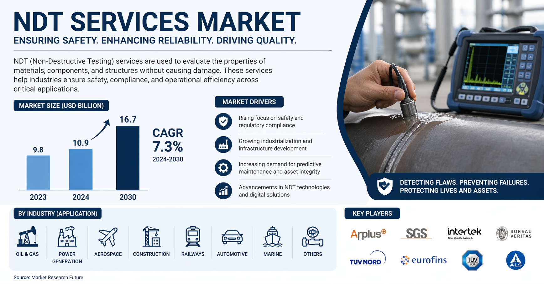 The market overview highlights the growing importance of advanced inspection technologies and predictive maintenance strategies. As industrial infrastructure expands globally, NDT services are becoming indispensable for ensuring asset reliability, reducing downtime, and enhancing safety standards.