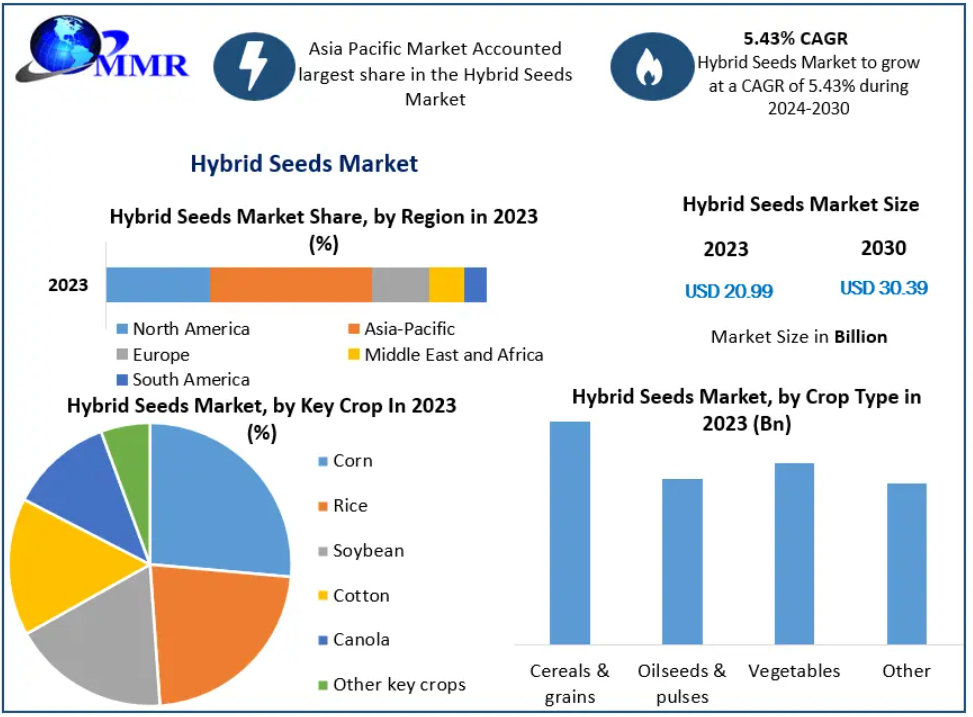 The global Hybrid Seeds Market is experiencing steady expansion, supported by the increasing need for higher agricultural productivity and improved crop quality. Valued at USD 20.99 billion in 2023, the market is projected to reach approximately USD 30.39 billion by 2030, growing at a CAGR of 5.43% during the forecast period (2024–2030).