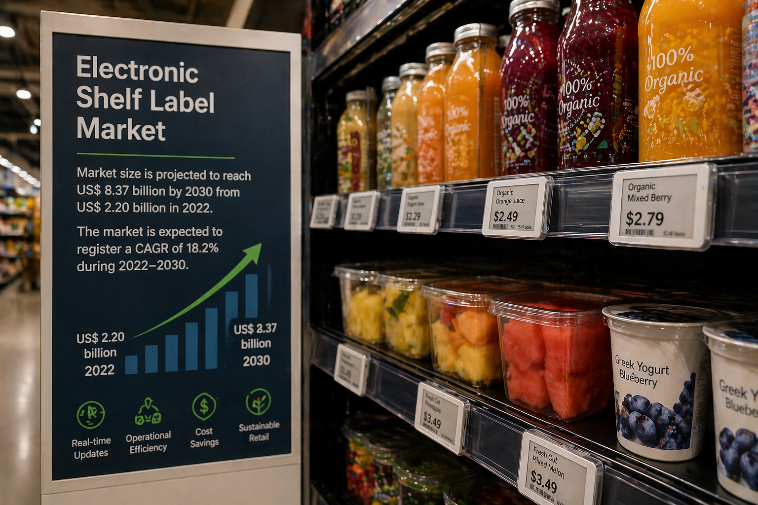 According to the Electronic Shelf Label Market Trends, the global Electronic Shelf Label Market is experiencing rapid expansion. The market is projected to grow from US$ 2.20 billion in 2022 to US$ 8.37 billion by 2030, registering a CAGR of 18.2% during the forecast period. This strong growth is driven by increasing demand for automation solutions and the growing need for efficient pricing management systems in the retail industry.