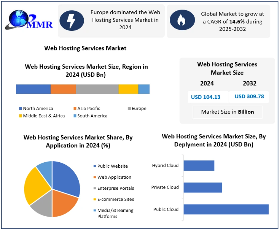 The global Web Hosting Services Market is witnessing strong momentum as digital transformation reshapes how businesses operate, communicate, and scale online. Valued at USD 104.13 billion in 2024, the market is projected to grow at a robust CAGR of 14.6% from 2025 to 2032, reaching nearly USD 309.78 billion. This growth trajectory is fueled by rapid cloud adoption, increasing SME digitization, and the expansion of e-commerce ecosystems worldwide.