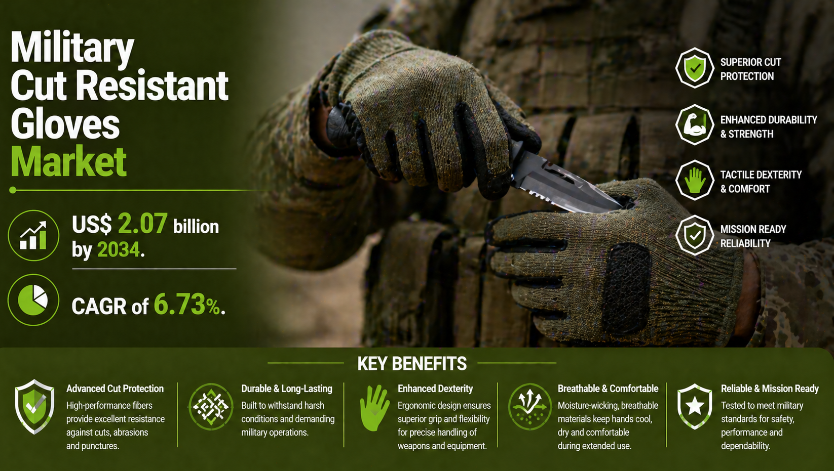 The Military Cut Resistant Gloves Market is projected to reach US$ 2.07 billion by 2034 from US$ 1.15 billion in 2025. The market is anticipated to register a CAGR of 6.73% during the forecast period 2026-2034.